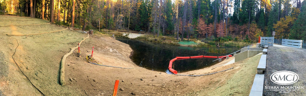 The project was to repair Lakewood Dam, in Twain Harte, CA. The construction consisted of (but was not limited to) installing a cofferdam at the base of Sullivan Creek, installing gabion baskets at the base of the spillway, building a reinforced concrete headwall, placing and compacting embankment fill, constructing a new reinforced concrete spillway, fabricating and installing a maintenance access bridge.